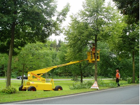 Bij het snoeien van grote hoeveelheden bomen bijvoorbeeld in een laan of langs de weg, zetten we soms een hoogwerker in. Ook bij het snoeien van jonge laanbomen werken we vaak met een hoogwerker, hierdoor kunnen we snel, efficiënt en veilig werken. Met name bij het snoeien van jonge bomen is het erg belangrijk dat er goed naar de toekomstige kroon wordt gekeken. Alle takken die boven de takvrije zone groeien (6 meter)gaan straks de blijvende kroon vormen, als we die kroon in een vroeg stadium al goed snoeien, als de takken nog dun zijn. Voorkomen we dat er later grote takken afgezaagd moeten wordn, voor de boom is dat natuurlijk ook beter want de wonden zijn nu nog maar klein en de boom kan de wonden dus snel overgroeien. Door vanuit de hoogwerker te werken kunnen we een goed overzicht houden en de jonge laanbomen optimaal snoeien.